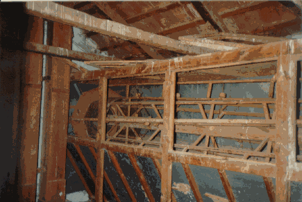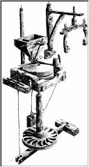 La muela inferior estaba anclada en una estructura fija, por encima del rodezno. A dicha base se sujetaba un sistema para regular la altura de la muela superior respecto de la inferior, con el fin de obtener la harina mas o menos fina.