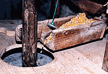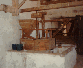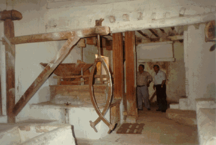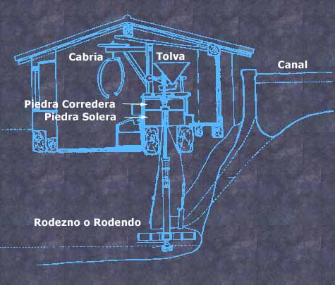 Una vez lleno este depósito se abría el saetín o saetilla desde la sala de la molienda y con la presión y potencia del chorro, se movían y giraban violentamente las palas o cucharas del rodezno, y la piedra volandera, unida a él por la maza, en su rozamiento con la fina, molturaba el grano que caía por la tolva, convirtiéndolo en harina.