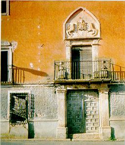 Imagen de la puerta principal del "Palacio de los Torrubias". Puede observarse sobre la puerta del balcon principal el escudo de armas de los mismos.
